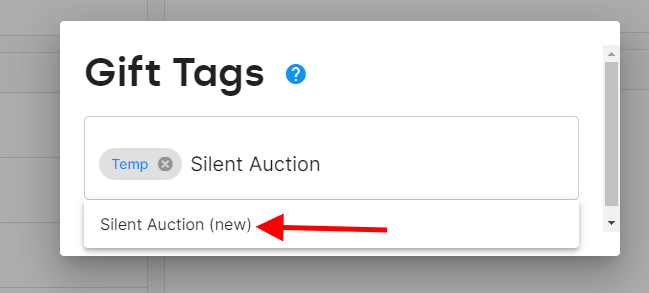 Search for the gift tag you wish to add. If adding an existing tag, click on the tag from the drop-down to add to the gift, then close out of the prompt box. To create a new gift tag, type in the name of the gift tag you wish to add, and once no results appear in the drop-down, click on the (new) option that appears to add the gift tag.