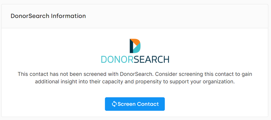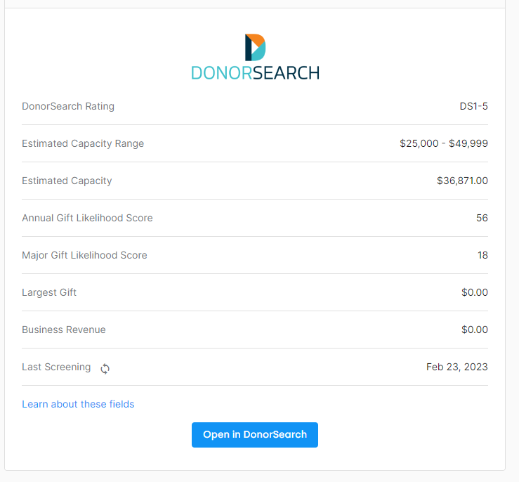 The DonorDock + DonorSearch integration surfaces key data points on your contact records in DonorDock, while providing a quick link to the full contact profile in DonorSearch.