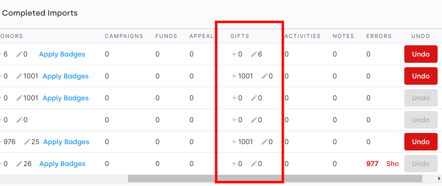 Import the updated excel document back into DonorDock. Navigate to Imports and upload the document using the import process. YOU MUST CONFIRM THE MAPPING OF GIFT ID TO GIFT ID FOR THE GIFTS TO CORRECTLY UPDATE. Once completed, the import screen will show you the number of gifts that have been added or edited during the import.