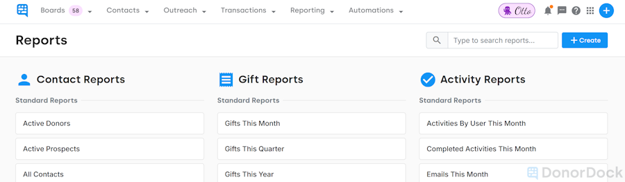 Reports help you make sense of the data you are tracking in DonorDock. They enable you to analyze contacts, gifts, and activities, allowing you to understand trends and measure outcomes better.
