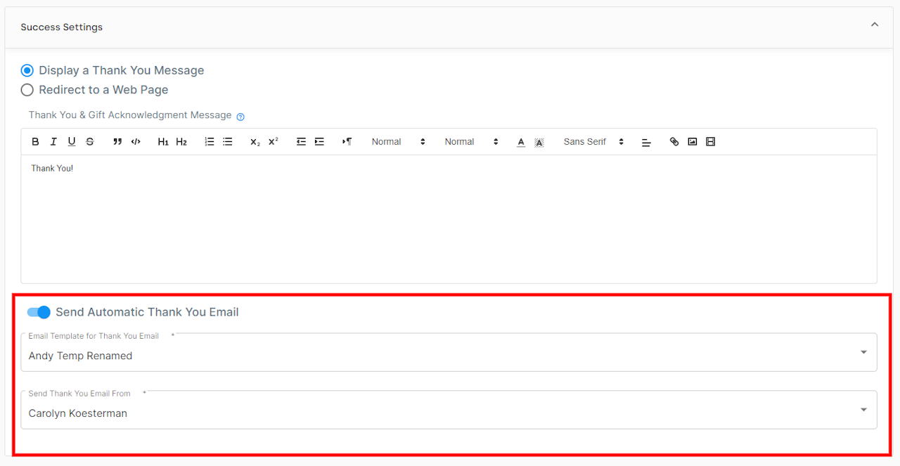 On the "Email Template for Thank you Email" dropdown, select the Transactional Template created